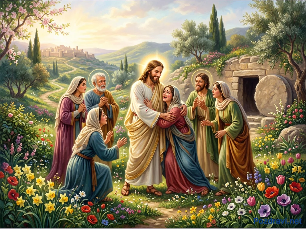 Тази картина изобразява библейска сцена на възкресението на Исус Христос, заобиколен от група хора в пищна градина. В центъра Исус, обвит в сияние, прегръща плачеща жена, вероятно Мария Магдалена, докато други фигури изразяват удивление и радост. На заден план вдясно се вижда отворена гробница с отместен камък, символизираща чудото. Пейзажът е изпълнен с ярки цветя, зелени хълмове и далечен град под слънчев небесен свод.