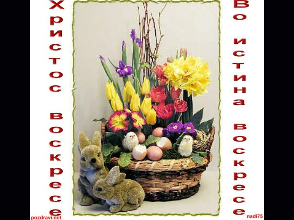 Ключови фрази: възкресение нова пролет нов живот радост възраждане яйца козунаци козунак писано яйце яйце боядисано яйце зайчета
