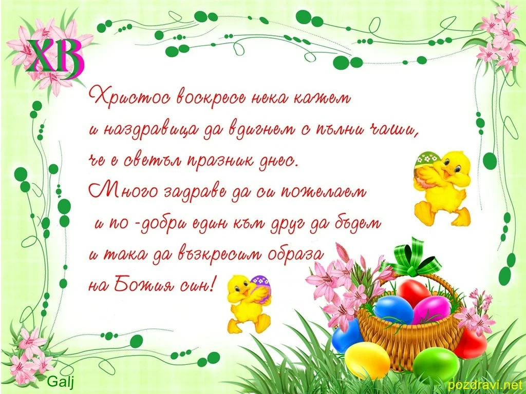 Христос воскресе нека кажем и наздравица да вдигнем с пълни чаши,че е светъл празник днес. Много задраве да си пожелаем и по -добри един към друг да бъдем и така да възкресим образа на Божия син!