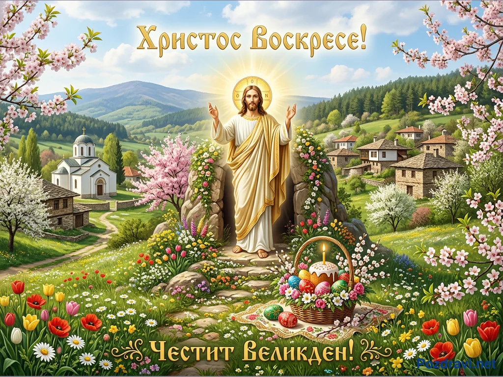 Ключови фрази: Великденска картичка, Христос Воскресе, Пролетен пейзаж, Исус Христос, Великденски яйца