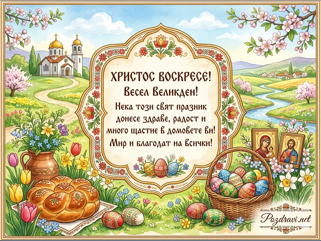 Картичката е хоризонтална, с размери 1024x768 пиксела. Тя е красиво илюстрирана в традиционен български стил и изобразява идиличен пролетен пейзаж. На заден план се вижда църква с куполи, слънчеви хълмове и цъфнали дръвчета. В центъра на композицията, в богато декорирана рамка, е поместен надпис на български: 'ХРИСТОС ВОСКРЕСЕ! Весел Великден! Нека този свят празник донесе здраве, радост и много щастие в домовете ви! Мир и благодат на всички!'. Рамката е украсена с пролетни цветя и орнаменти.