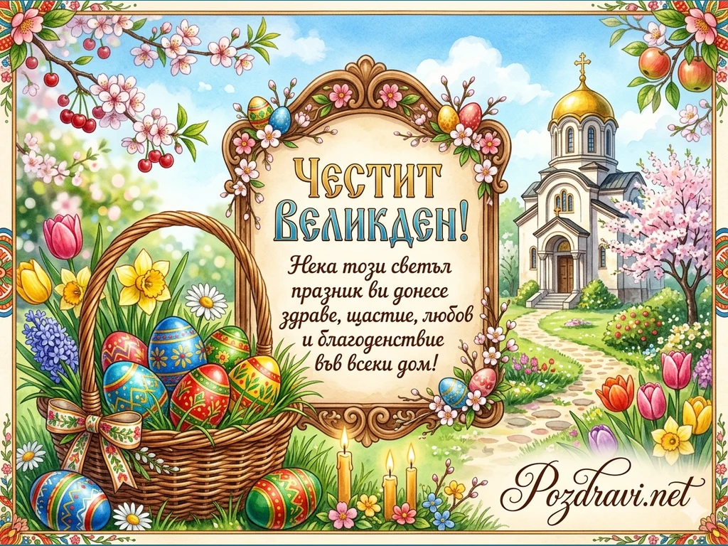 Картичката е изпълнена с традиционни елементи без зайци – с яйца, цветя, църковни свещи и пролетна символика, което я прави идеална за изпращане на най-топли великденски пожелания.