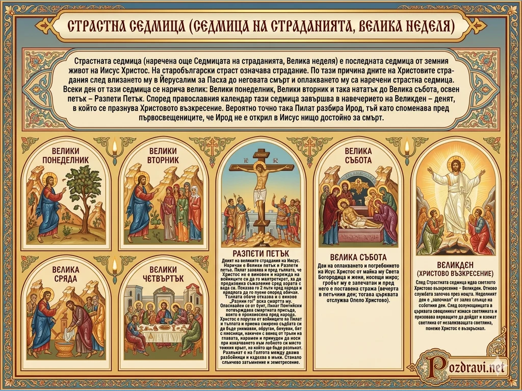 Най-отгоре, в специален декоративен банер, е изписано главното заглавие: СТРАСТНА СЕДМИЦА (СЕДМИЦА НА СТРАДАНИЯТА, ВЕЛИКА НЕДЕЛЯ). Под заглавието има по-голямо текстово поле с уводен текст, който обяснява значението на седмицата според православния календар.