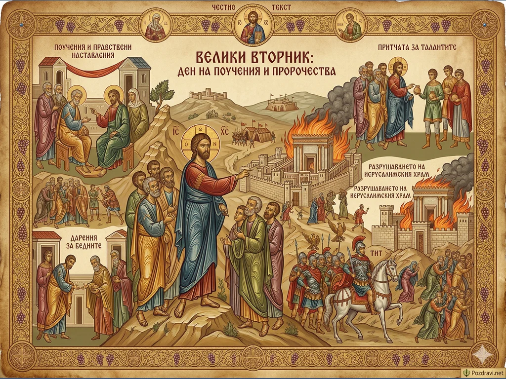 Картината представя многопластова иконографска композиция, посветена на събитията от Велики вторник. В центъра Иисус Христос сочи към пророческото видение за разрушаването на Йерусалимския храм, обгърнат в пламъци. Отделни сцени илюстрират притчата за талантите и призива за милосърдие към бедните, разположени върху класически пергаментов фон. Изобразени са и римските легиони под предводителството на Тит, подчертавайки историческата тежест на предсказанието. Стилът е богат на детайли и надписи на български език, носещи духа на Страстната седмица.