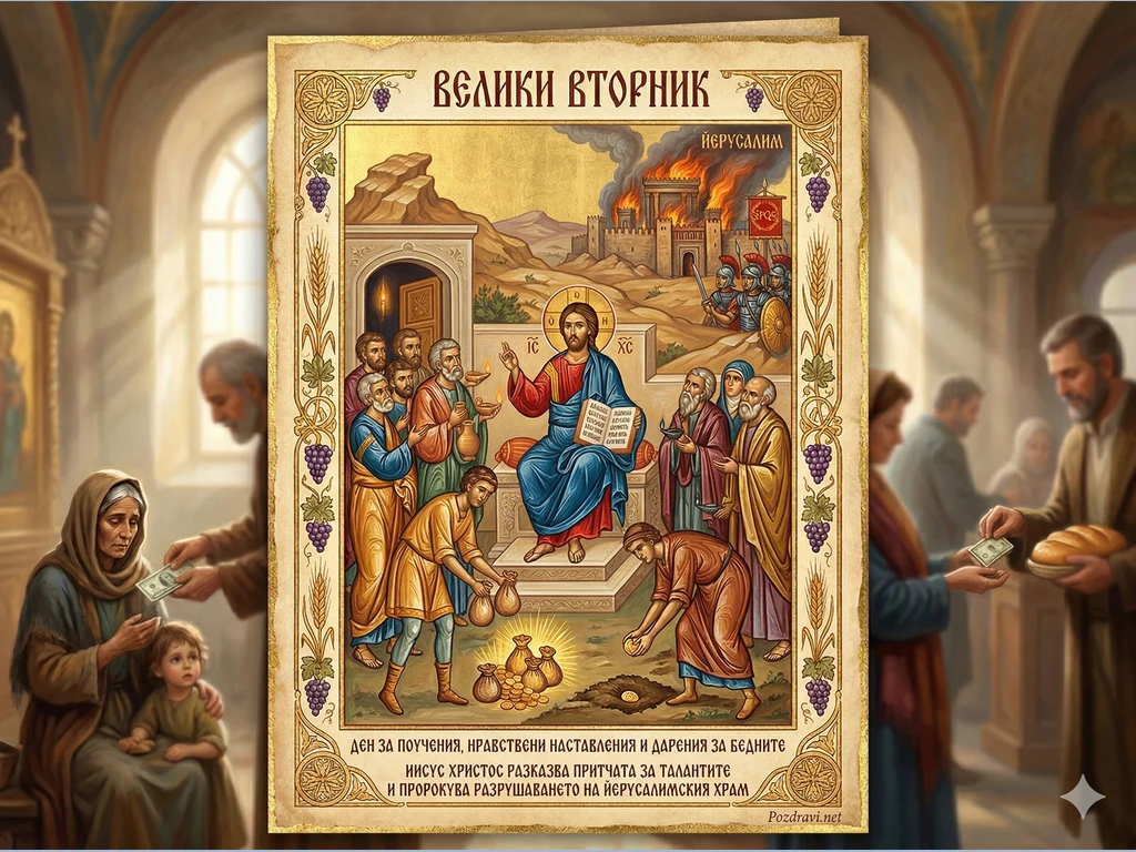 Картината изобразява централната фигура на Иисус Христос, който проповядва сред своите ученици в стилистиката на класическа икона. В долната част е пресъздадена притчата за талантите чрез фигури, заравящи и умножаващи златни монети, а на заден план се вижда пророческото видение за горящия Йерусалим. Композицията е рамкирана от богати орнаменти с гроздове и житни класове, символизиращи духовното плодородие. От двете страни са добавени съвременни сцени на милосърдие и дарения за бедните, свързващи библейския текст с традициите на Страстната седмица. Цялостната визия съчетава тържественост и поучение, подчертавайки смисъла на Велики вторник.