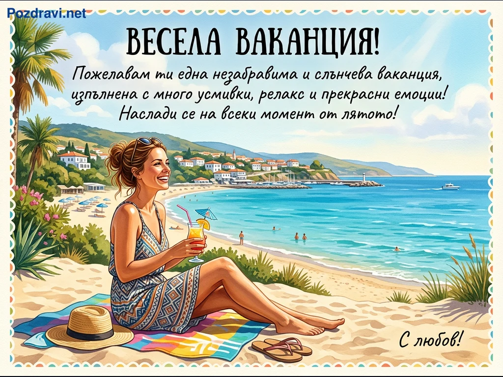 Тази цветна илюстрация изобразява идилична плажна сцена под ясно синьо небе. В центъра е усмихната жена с коктейл в ръка, седнала на шарена кърпа върху златист пясък, до която са поставени сламена шапка и джапанки. Зад нея се простира тюркоазено море с плуващи хора, а на хоризонта се вижда живописен крайбрежен град с бели къщи и зелени хълмове. Палми и буйна растителност допълват тропическата атмосфера, а надписът 'ВЕСЕЛА ВАКАНЦИЯ!' и пожелание за незабравимо лято допринасят за празничното настроение.