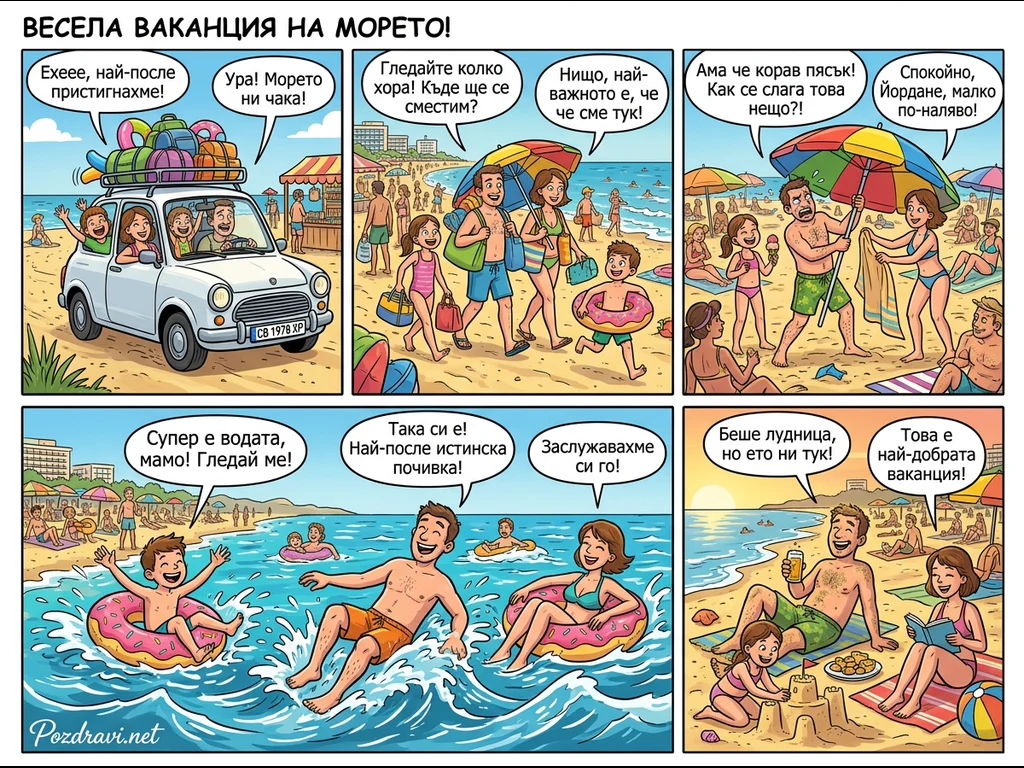 Ключови фрази: семейна ваканция на море, лятна почивка плаж, комикс за море, забавления на плажа, щастливо семейство