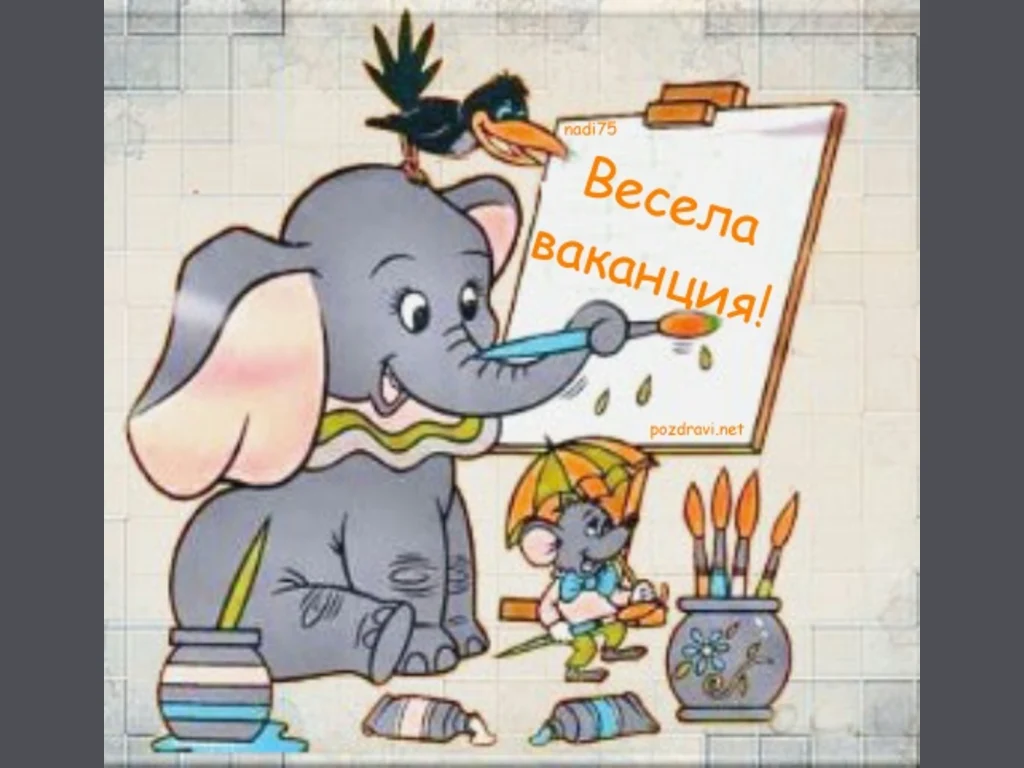 Ключови фрази: почивка, лято, ваканция, слончета, рисунки, край, училище, море, планина, поздрав, пожелание, лятна, село, лагер, екскурзия, плаж, палми