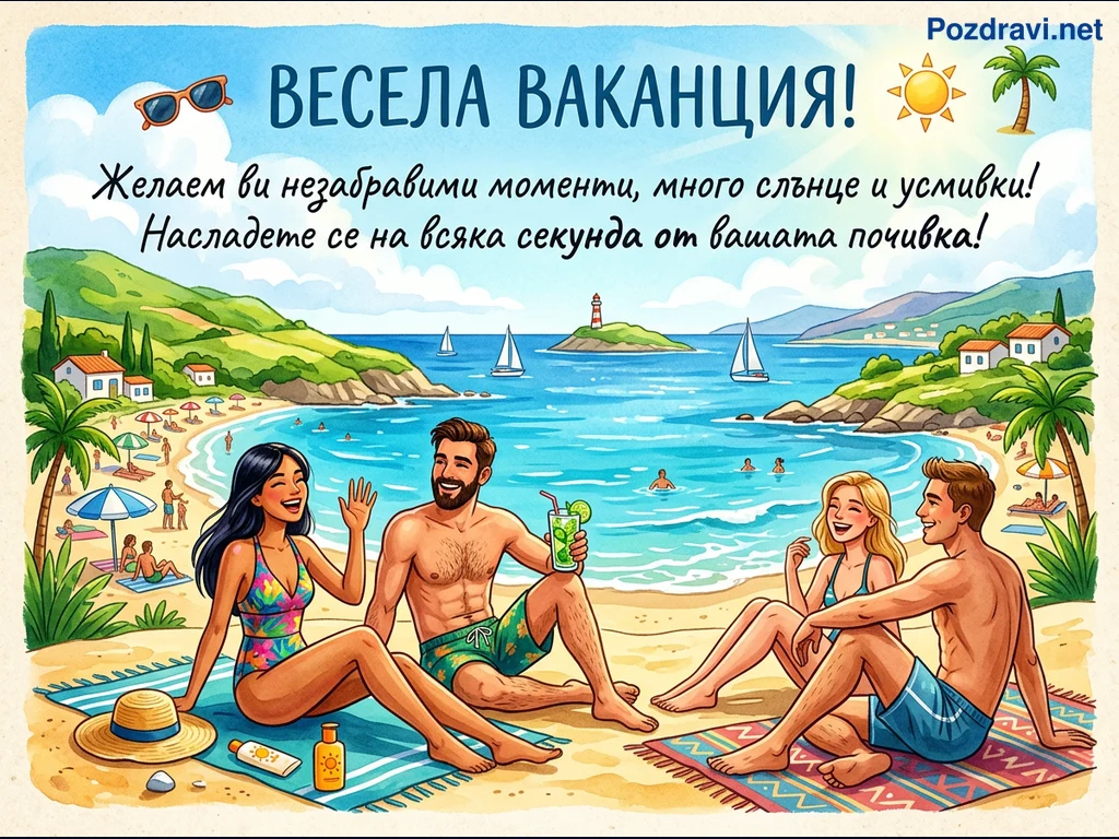 Тази цветна илюстрация изобразява оживена плажна сцена под ясно синьо небе. В преден план две двойки се наслаждават на слънцето, седнали на пясъка върху плажни кърпи, като един от мъжете държи освежаваща напитка. На заден план се виждат множество хора, чадъри и палми по брега, а в тюркоазеното море плават ветроходни лодки около малък остров с фар. Над сцената е изписано 'ВЕСЕЛА ВАКАНЦИЯ!' с пожелание за незабравими моменти, слънце и усмивки, допълнено от икони на слънце, палма и слънчеви очила. Цялостната атмосфера е на радост, релакс и лятно настроение.