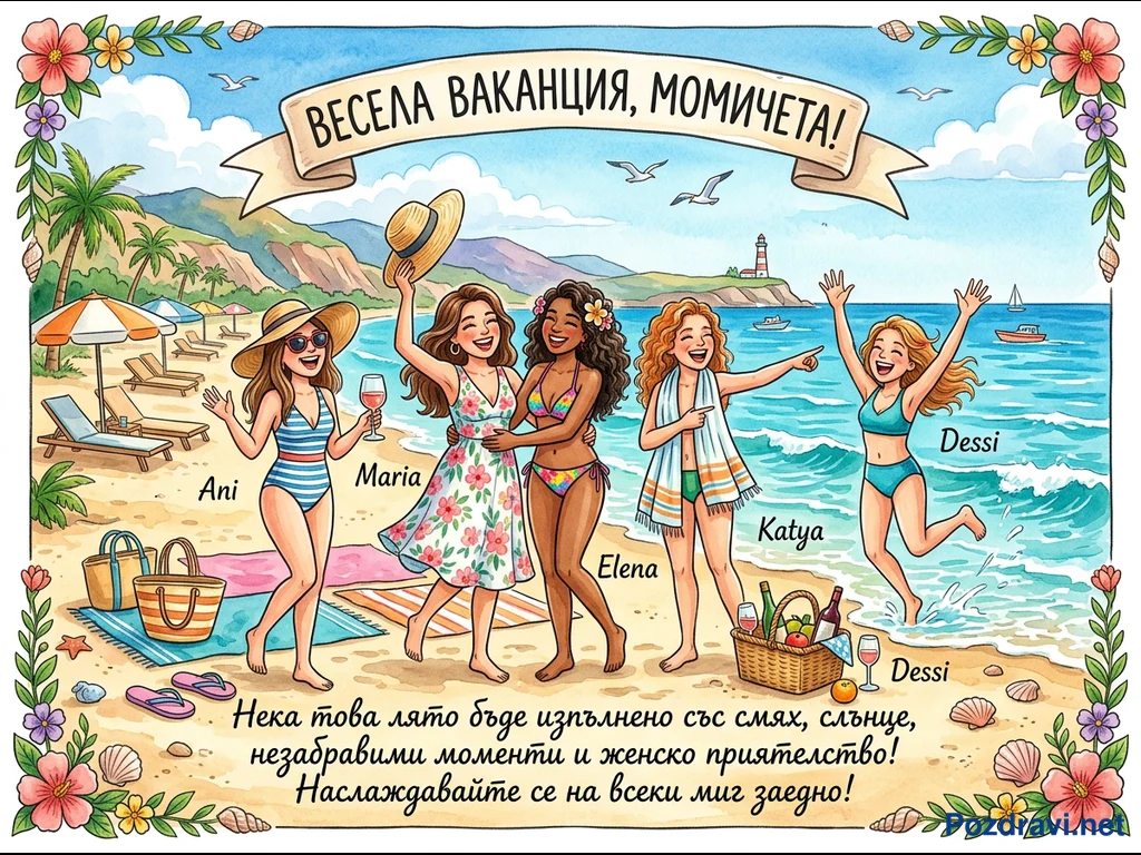 На картината е изобразена весела група от пет приятелки – Ани, Мария, Елена, Катя и Деси – наслаждаващи се на слънчева ваканция на морски плаж. Те са усмихнати и щастливи, облечени в бански костюми и летни рокли, като някои от тях държат чаши с напитки или позират игриво във водата. На заден план се виждат шезлонги, чадъри, палми, фар и лодки в синьото море, а над тях се носи транспарант с надпис 'ВЕСЕЛА ВАКАНЦИЯ, МОМИЧЕТА!'. В долната част на илюстрацията има послание за лято, изпълнено със смях, слънце и незабравими моменти на женско приятелство. Цялостната композиция е рамкирана от цветя и миди, създавайки жизнерадостна и празнична атмосфера.