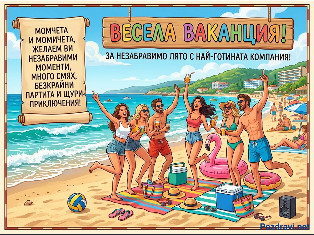 Ключови фрази: Весела ваканция, лятна почивка, приятели на плажа, поздравителна картичка, анимация лято