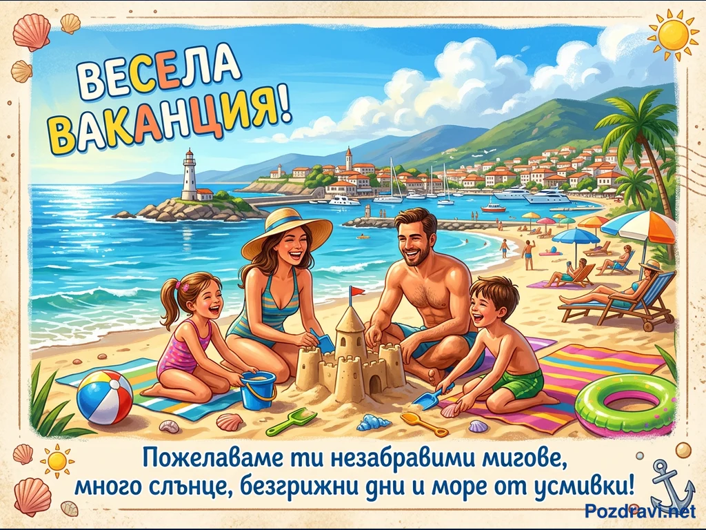 Тази цветна илюстрация изобразява щастливо семейство – родители с две деца, които строят пясъчен замък на слънчев плаж. На заден план се вижда живописен крайбрежен град с бели къщи, фар на скалист нос и множество лодки в спокойния залив, обграден от зелени планини. Други хора се наслаждават на почивката си, лежащи под цветни чадъри. Картичката е с надпис 'ВЕСЕЛА ВАКАНЦИЯ!' и пожелание за незабравими мигове, слънце и усмивки.