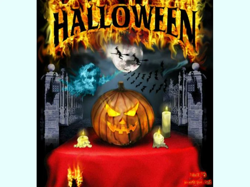 Ключови фрази: Хелоуийн католически празник светци ноември църква умрели страшна светеща тиква маса свещи ято прилепи зловещ замък сатанински огън дяволчета метли