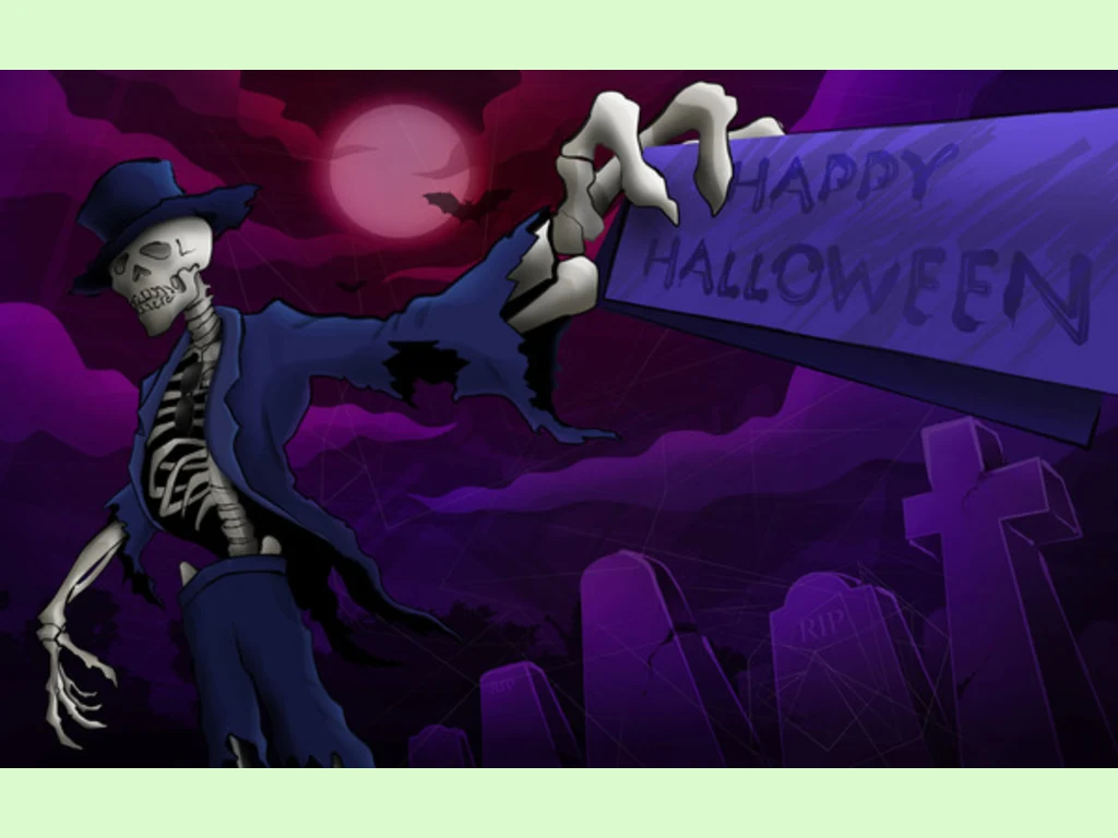 Ключови фрази: Картичка пожелание поздрави весел празник прилепи скелет черен котарак пълнолуние зловещ замък тикви призрачна качулка нощ Хелоуин