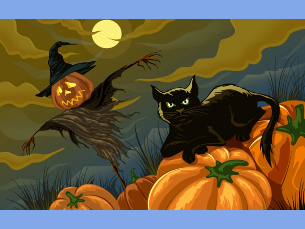 Ключови фрази: Картичка пожелание поздрави весел празник прилепи черен котарак пълнолуние зловещ замък тикви призрачна качулка нощ Хелоуин
