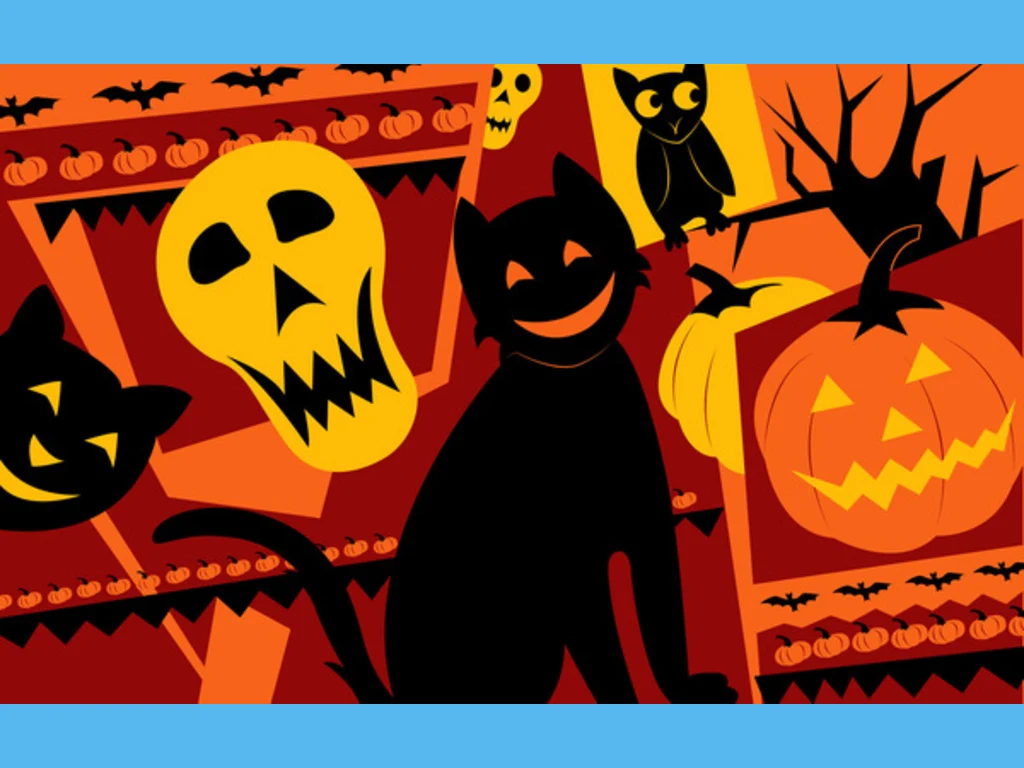 Ключови фрази: Картичка пожелание поздрави весел празник прилепи котка черен зловещ замък светещи тикви призрачна качулка нощ Хелоуин