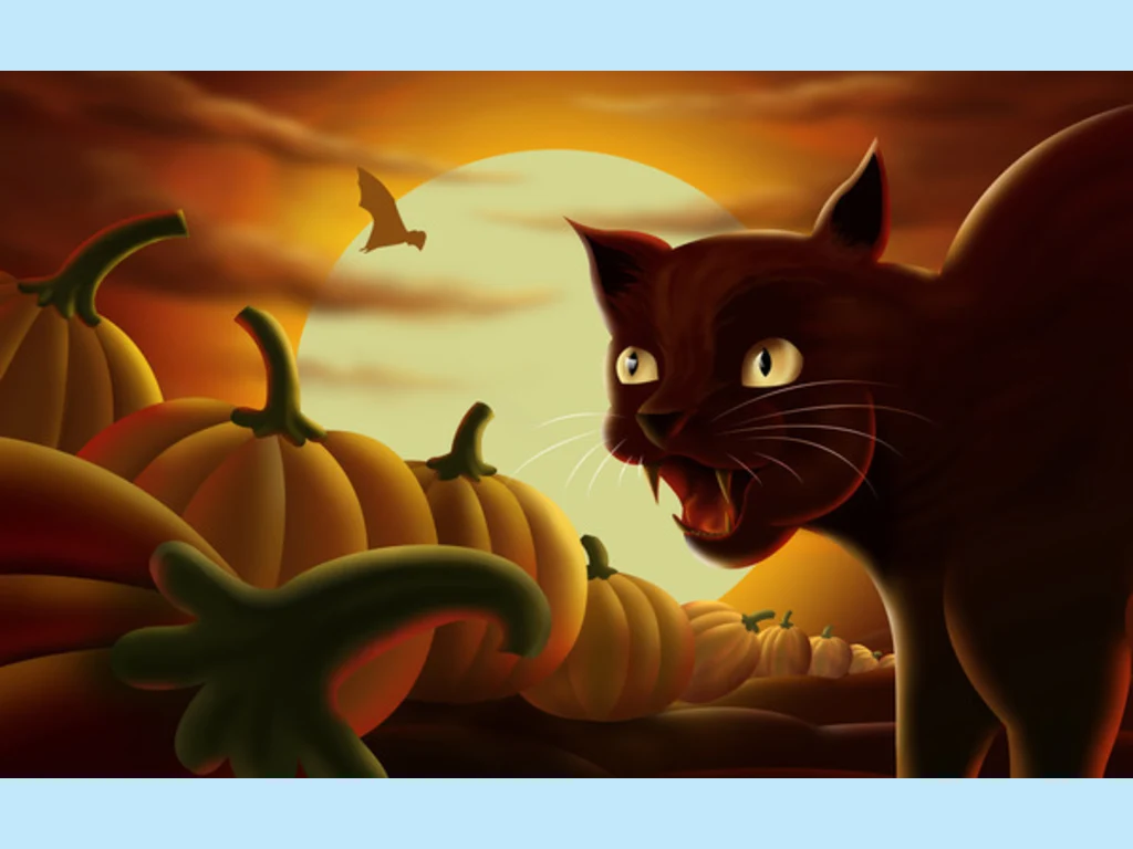 Ключови фрази: Картичка пожелание поздрави весел празник прилепи черен котарак зловещ замък тикви призрачна качулка нощ Хелоуин