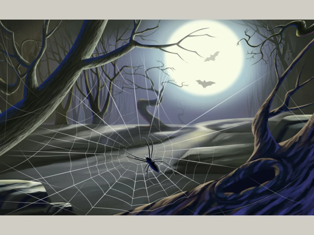 Ключови фрази: Картичка Хелоуин поздрави пожелание нощна мистерия паяк паяжина пълнолуние прилепи гора празник