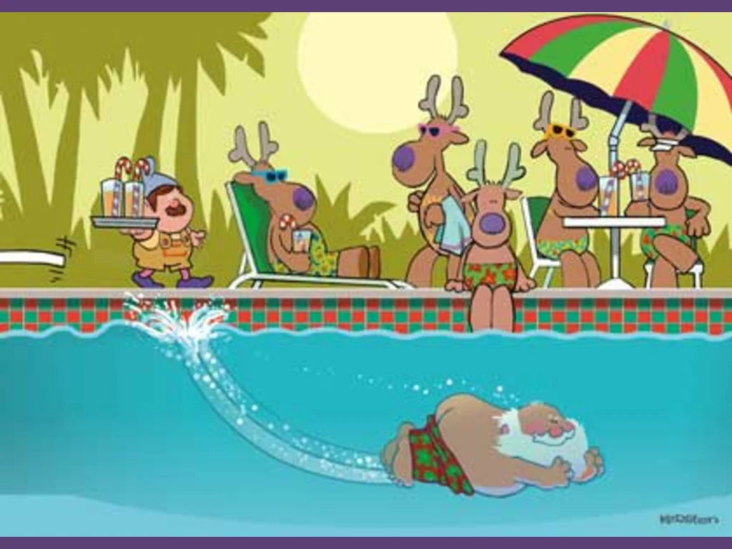 Ключови фрази: Дядо Коледа картичка елени басейн гмуркане плаж коктейли палми скеч забавна смешна комикс рисувана