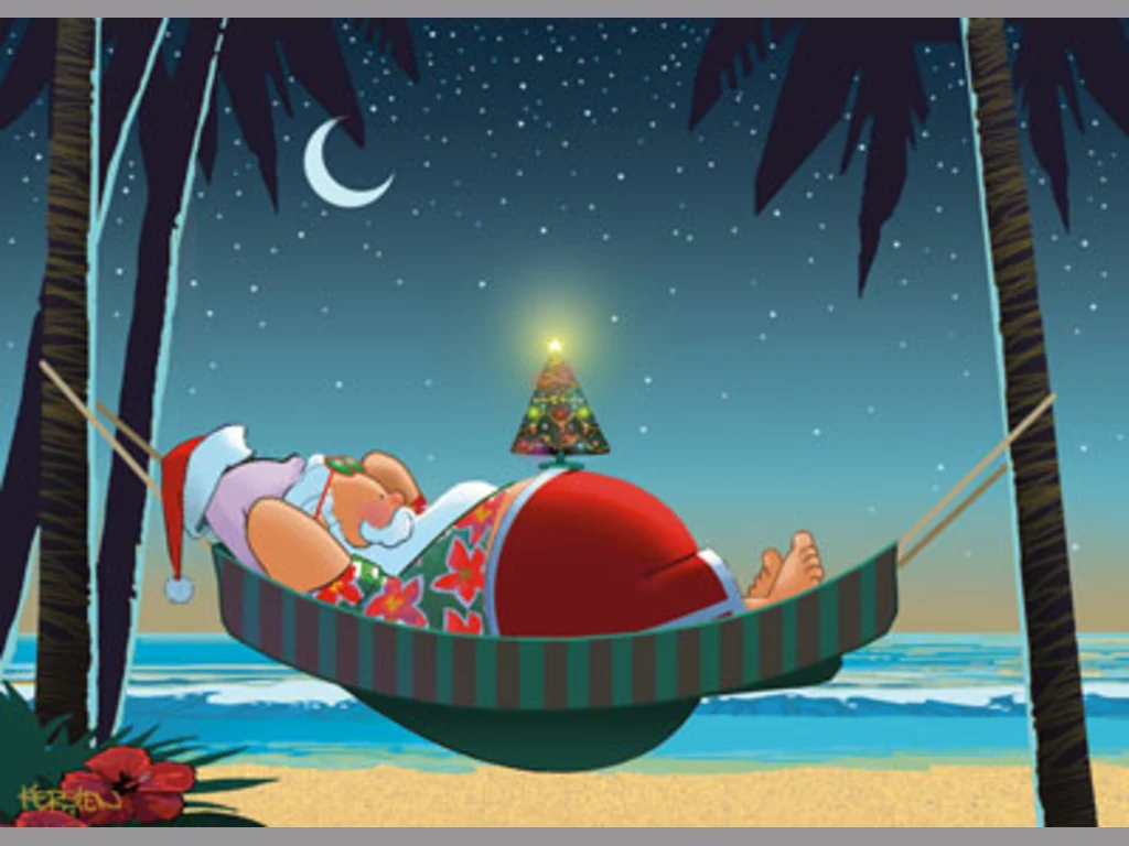 Ключови фрази: Дядо Коледа картичка Коледни празници хамак звездна нощ вълни морски южен бряг палми цветя любов почивка скеч забавна смешна комикс рисувана