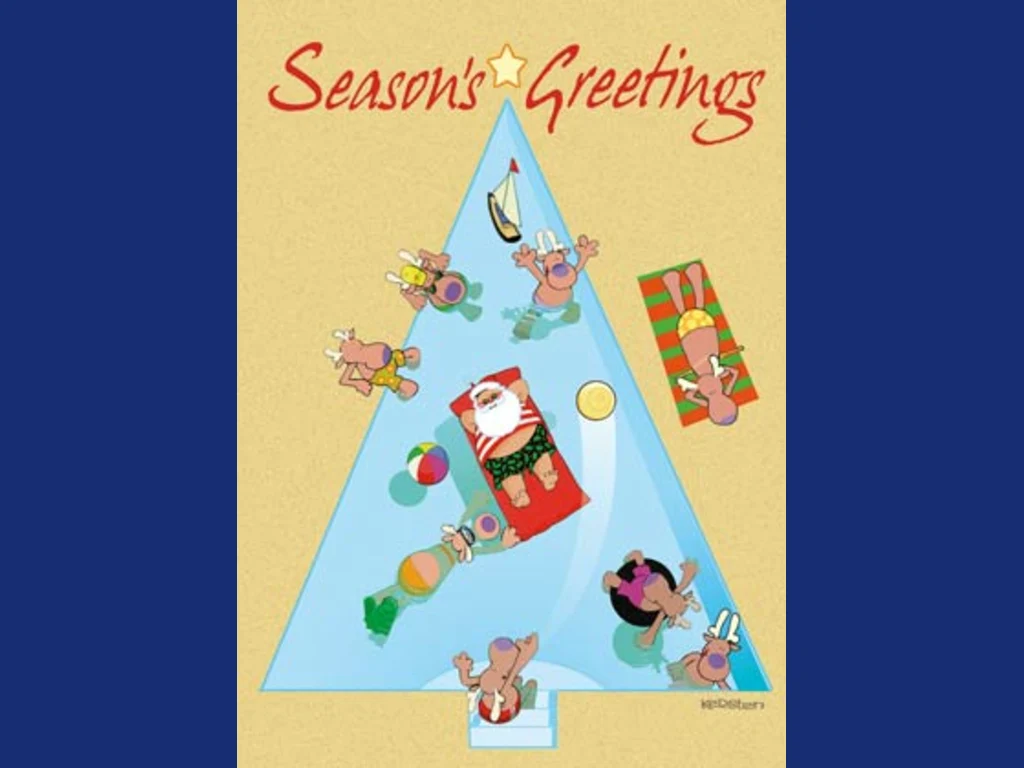 Ключови фрази: Дядо Коледа картичка елени вода басейн плаж скеч забавна смешна комикс рисувана