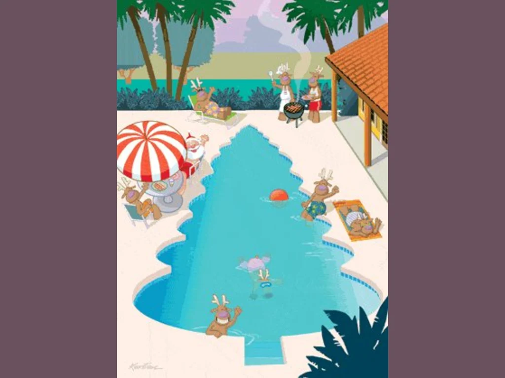 Ключови фрази: Дядо Коледа картичка елени басейн коледна елха слънце барбекю палми плаж скеч забавна смешна комикс рисувана